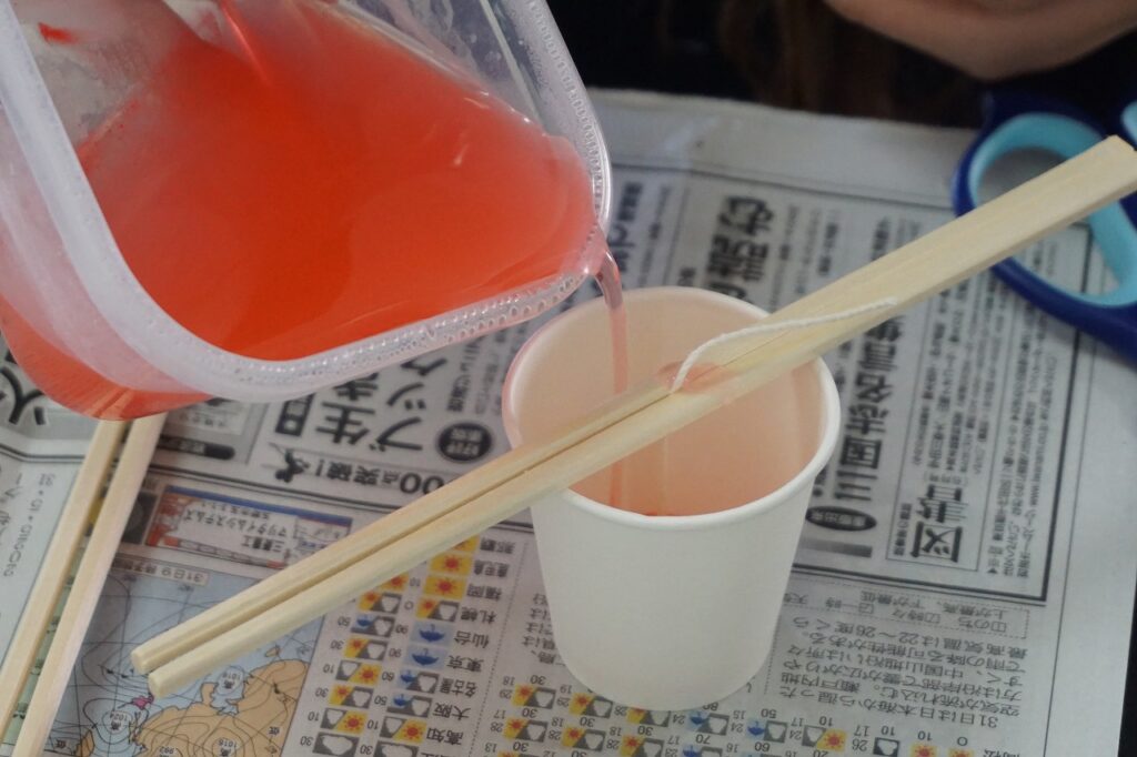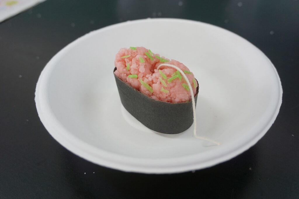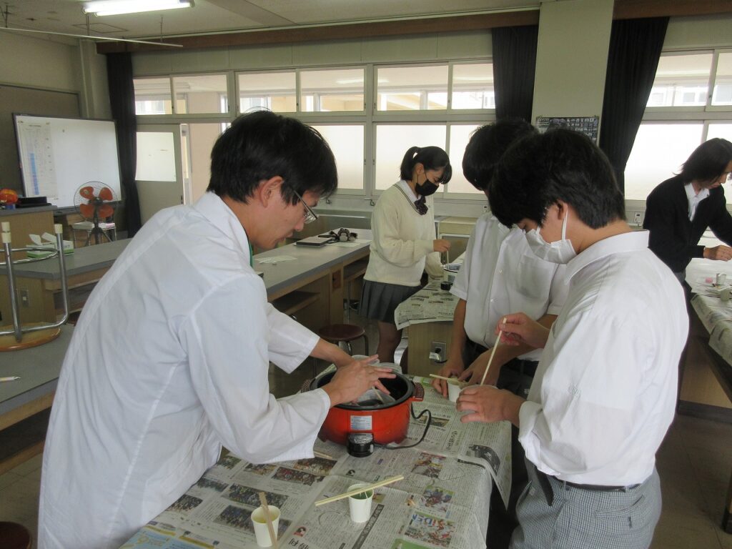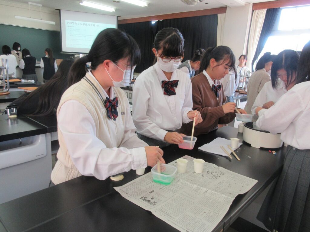 『宇宙と自然』の授業で各自がデザイン案を考え、世の中に1つしかないキャンドルを製作しました。色づけや香りにもこだわり、それぞれがオリジナルの物を作りました。思ったように作業は進みませんでしたが、仕上がりを楽しみに活動しました。きれいなバラの花やネギトロの寿司などユニークなものも完成しました。
