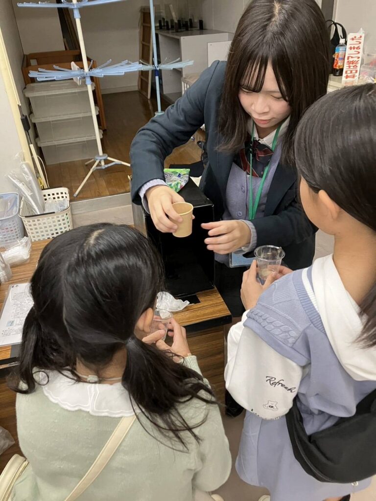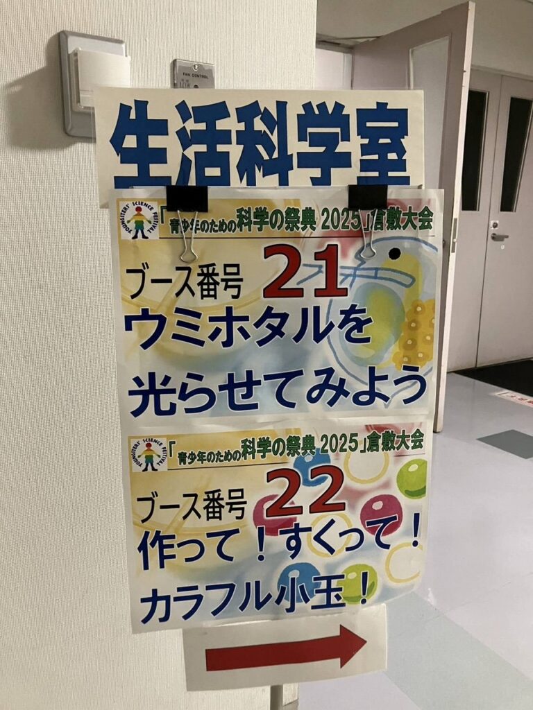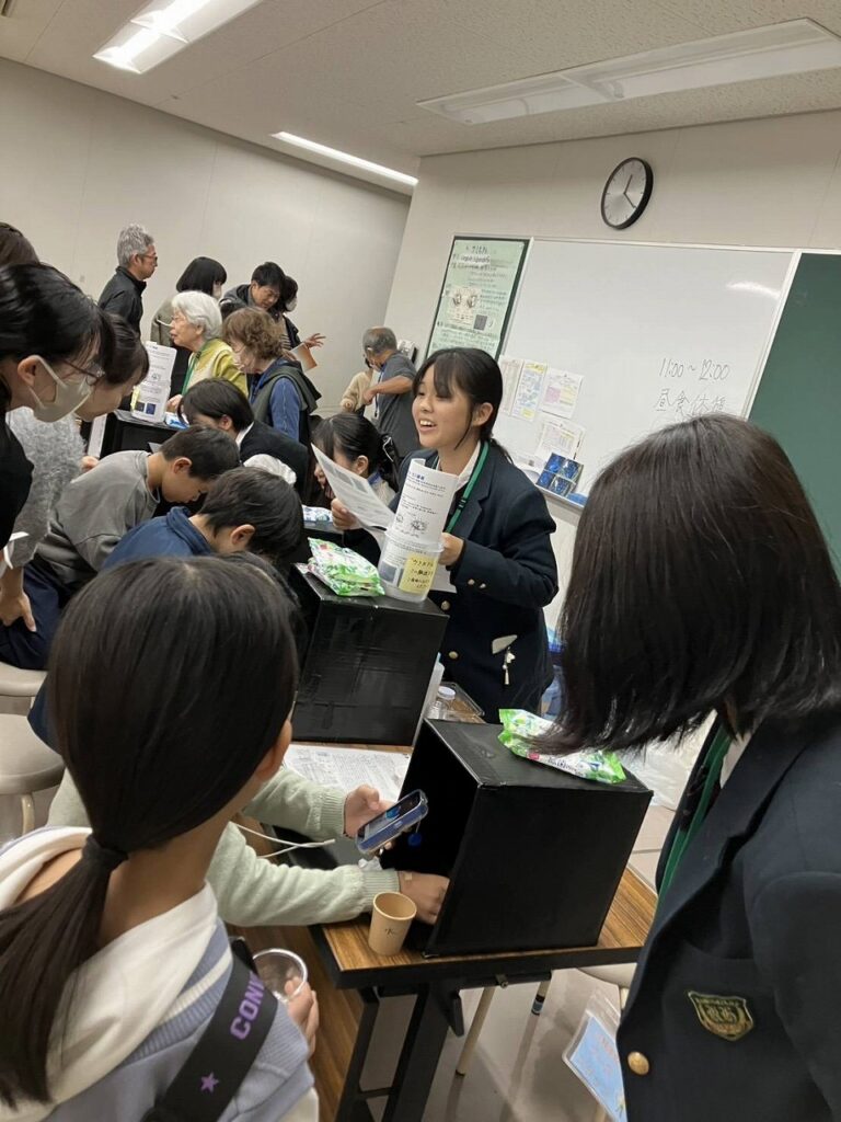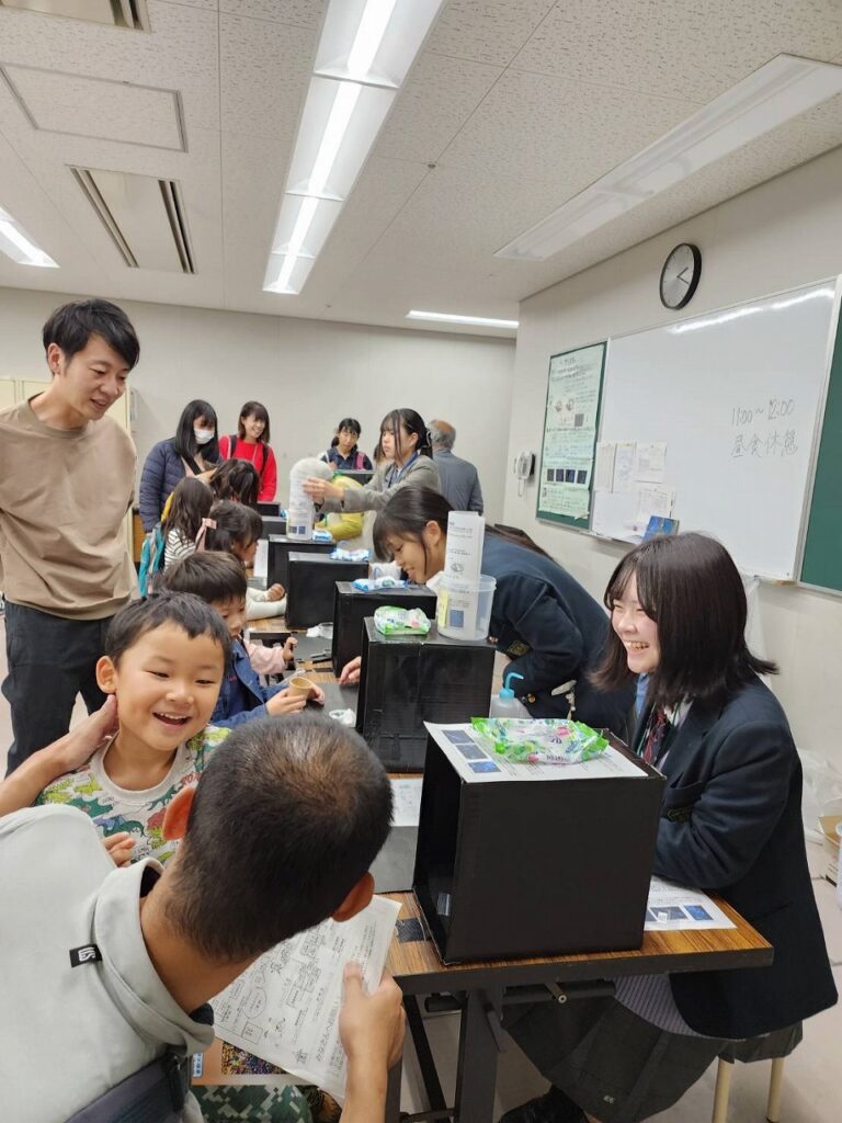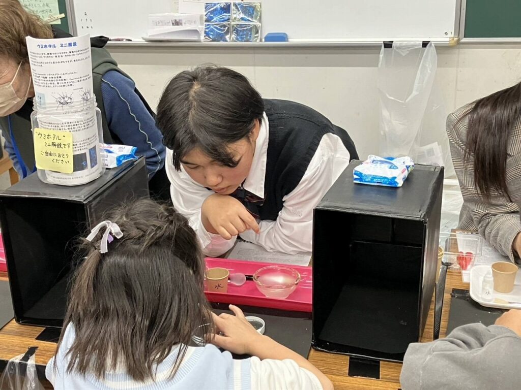 ボランティア希望の1・2年生が11月8日(土)・9日(日)に「ウミホタルを光らせてみよう」ブースの補助講師を務めました。約350人の子ども達と保護者にウミホタルの生態や発光の仕組みについて説明をし、実験補助を行いました。生きているウミホタルに刺激を与えて発光する様子や、乾燥させたウミホタルをつぶしてそれに含まれる物質の化学反応で発光する様子を観察してもらいました。青く美しい光に子ども達が笑顔になり、こちらも嬉しい体験でした。科学の魅力をさらに広めていきたいです。