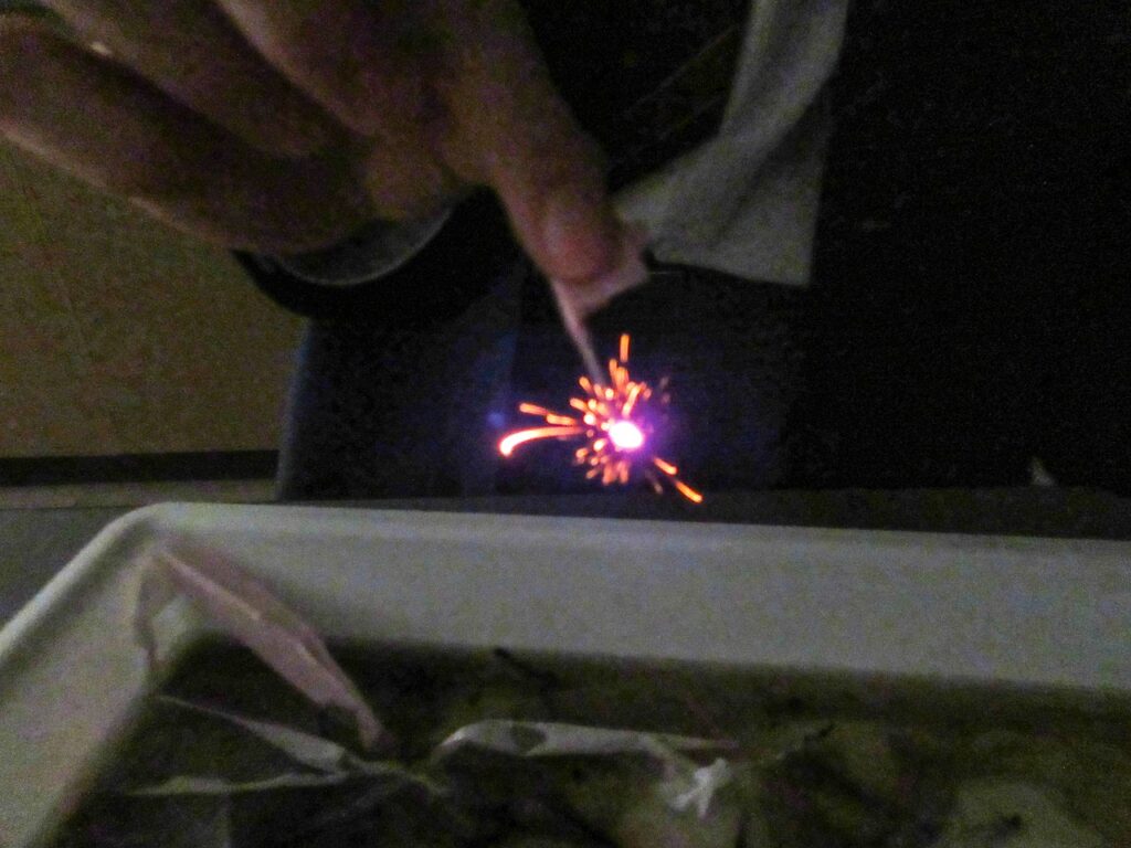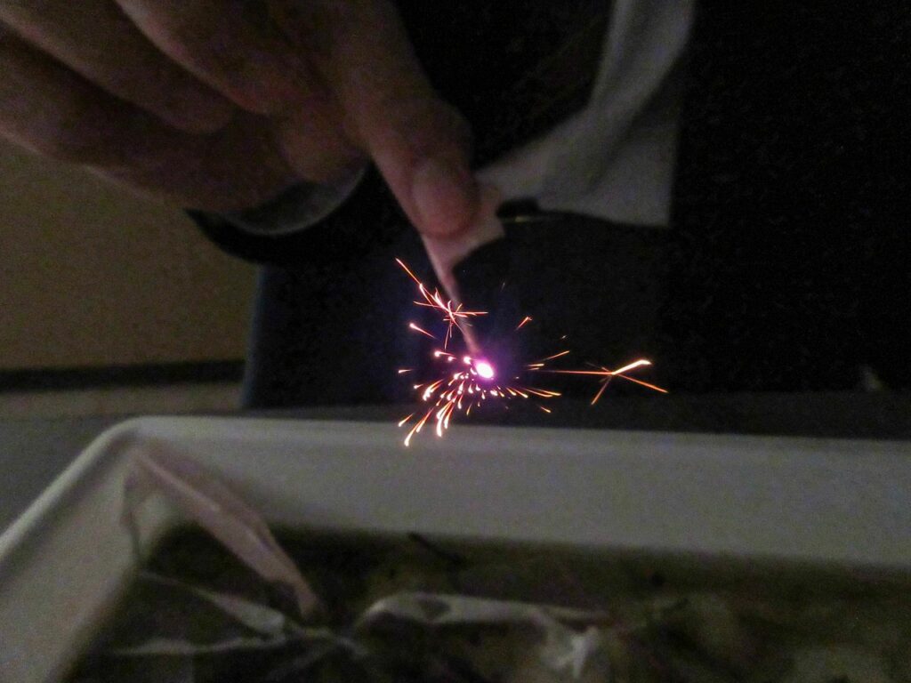 宇宙と自然の授業(2年・3年)で線香花火作りに挑戦しました。非火薬線香花火の和剤を計量して、乳鉢でむらがなくなるようによく混ぜ合わせます。そして和紙に和剤をのせて巻き上げ『こより』にして仕上げました。この和剤のうち、松煙を手作りする手間がとても大変で、夏に作業するにはとても困難であるため冬の花火となりました。のせ方や巻き方を色々工夫しましたが、とても難しくて何度も何度も挑戦しました。そのうち着火すると火球が震え、段々火花が飛び出すようになりました。燃え方には段階があり、その後は火花の小さい「散り菊」になり燃え尽きました。伝統ある情緒豊かな日本の花火に感動しました。また非火薬線香花火を自作するという良い体験ができました。