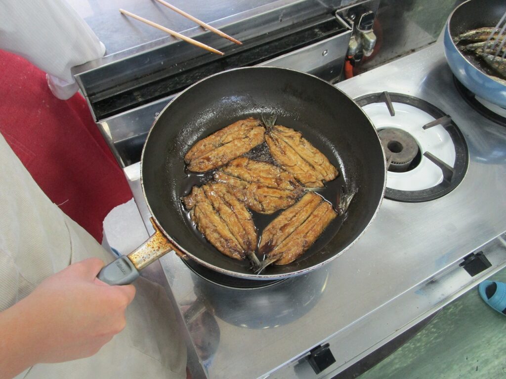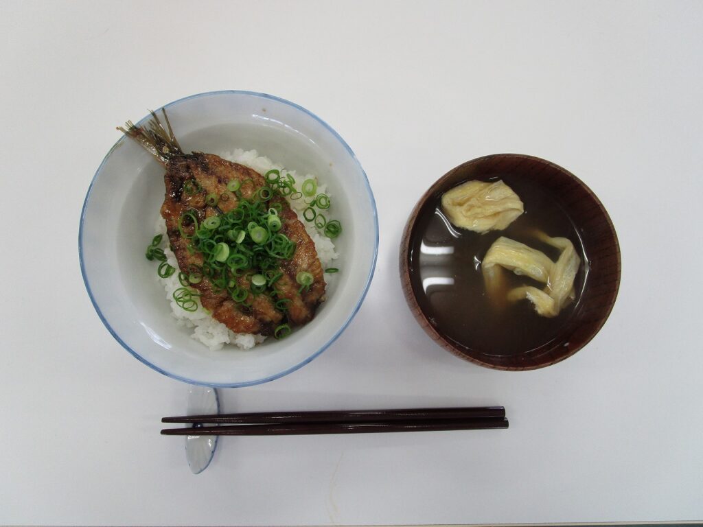 食品の授業で学んだ「魚介類」「豆類」の知識を活かして、鰯の蒲焼き丼と湯葉のすまし汁を作りました。鰯は包丁を使わずに指先で骨を外し、身を綺麗に広げる作業に挑戦しました。初めてでも丁寧に身を動かすことで、綺麗にさばくことができ、魚の構造や食材を扱う面白さを実感している様子が見られました。また、豆乳がゆっくりと膜を張っていく様子を観察しながら、湯葉作りにも挑戦しました。