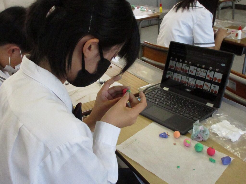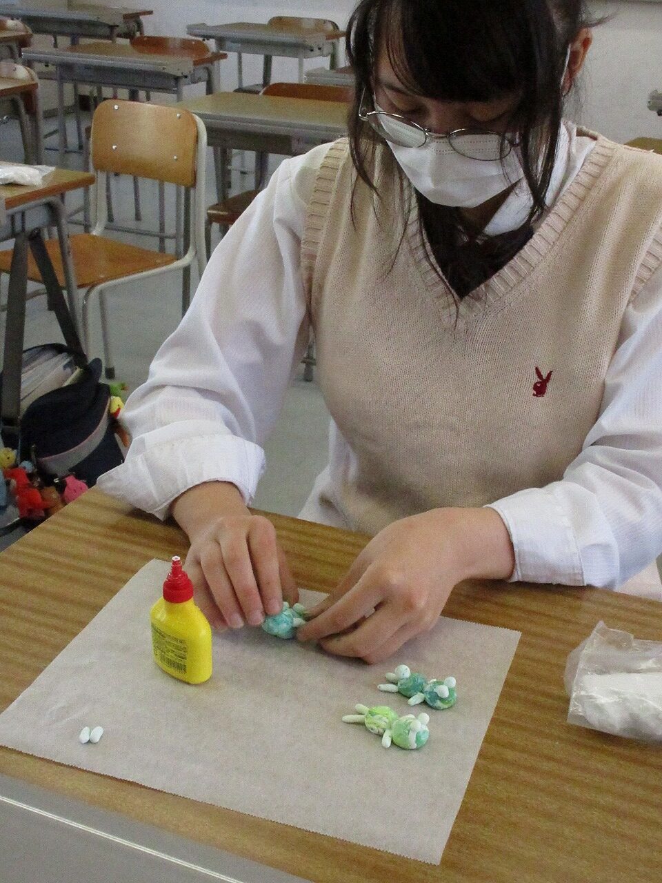 3年保育モデルの生徒が紙粘土でオリジナルの「〇〇つり」を作りました。1学期は平面構成に取り組みましたが、立体構成も創意工夫をして楽しい作品ができあがりました。