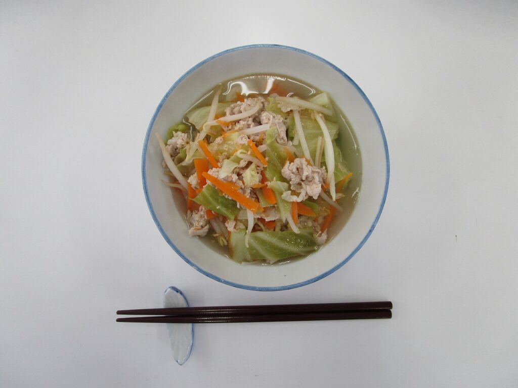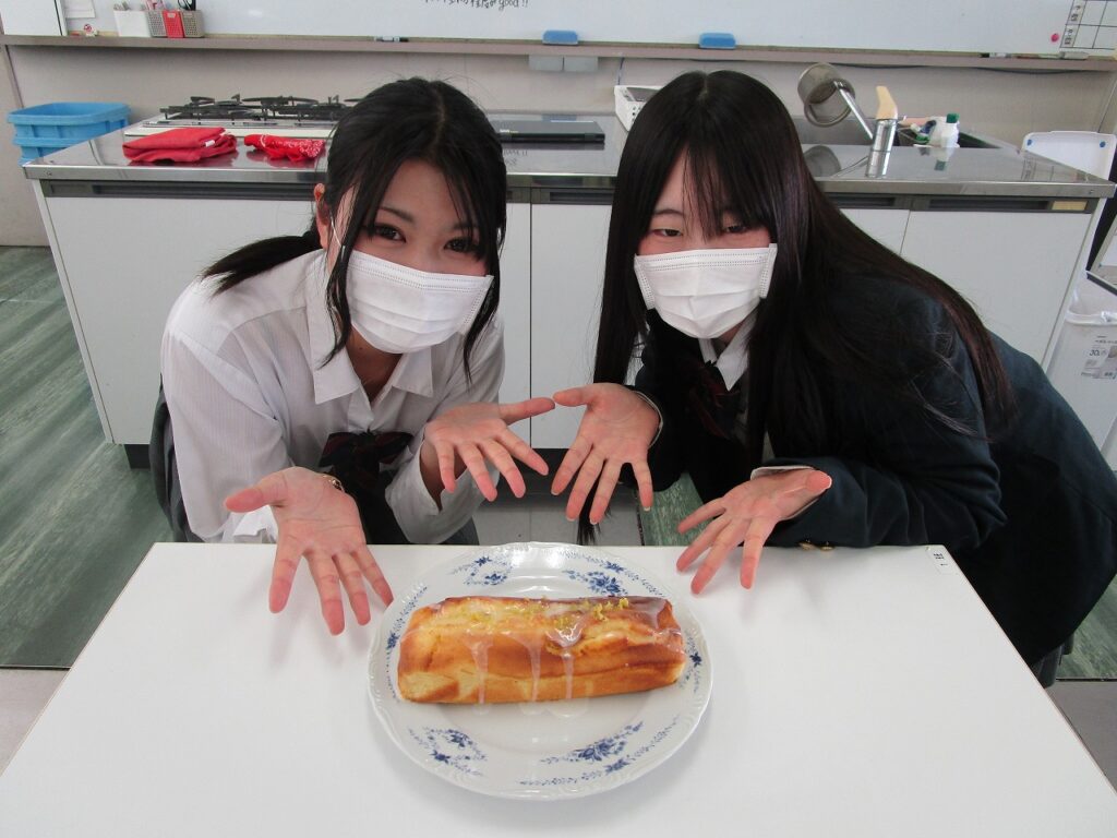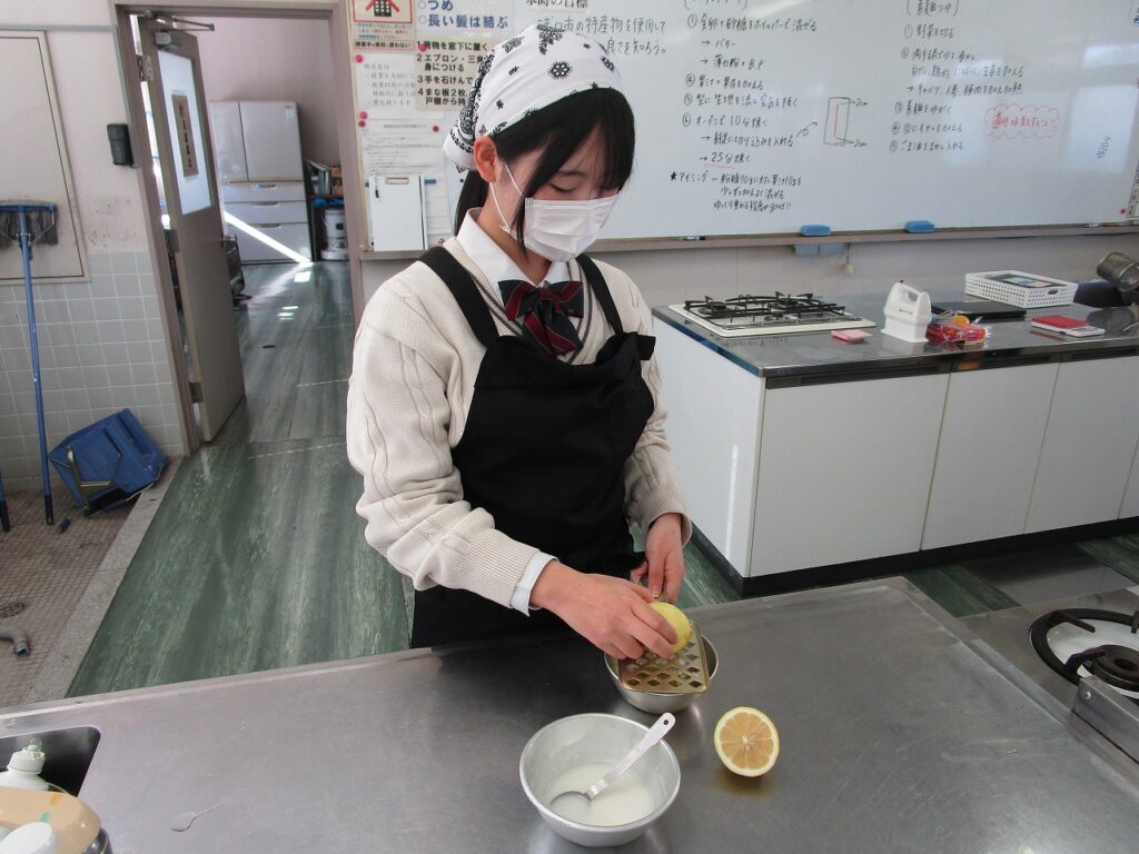食品の授業では、浅口市の特産品である「かも川手延素麺」と「三ツ山レモン」を使った調理実習を行いました。浅口市の特産品を調べ、それぞれの食材の魅力を伝えるために、生徒がメニューを考案し、野菜たっぷりの煮麺とレモンの爽やかな香りが広がるパウンドケーキを作りました。寒い季節にぴったりな身体温まる美味しいメニューとなり、浅口市の食材の魅力を改めて学ぶことができました。