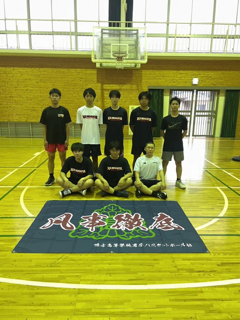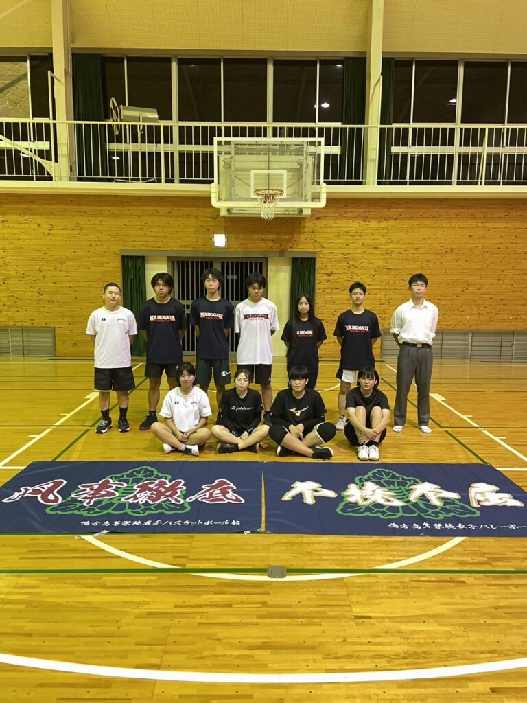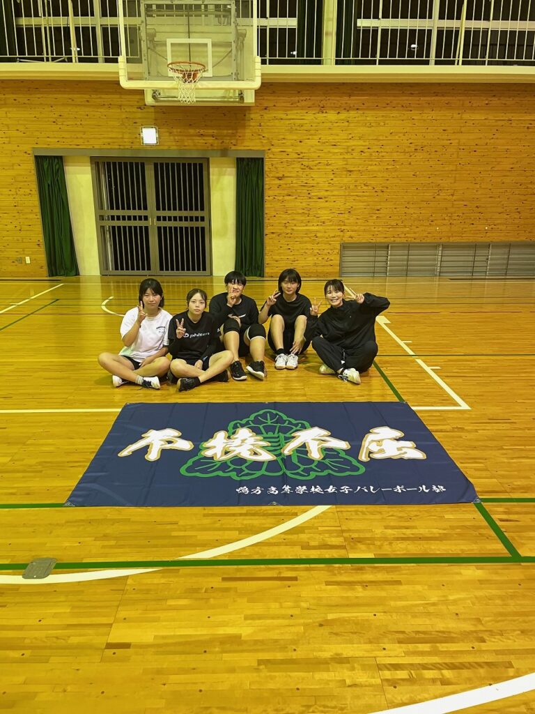 男バスの練習コートには「凡事徹底」、女バレの練習コートには「不撓不屈」が掲げてあります。
