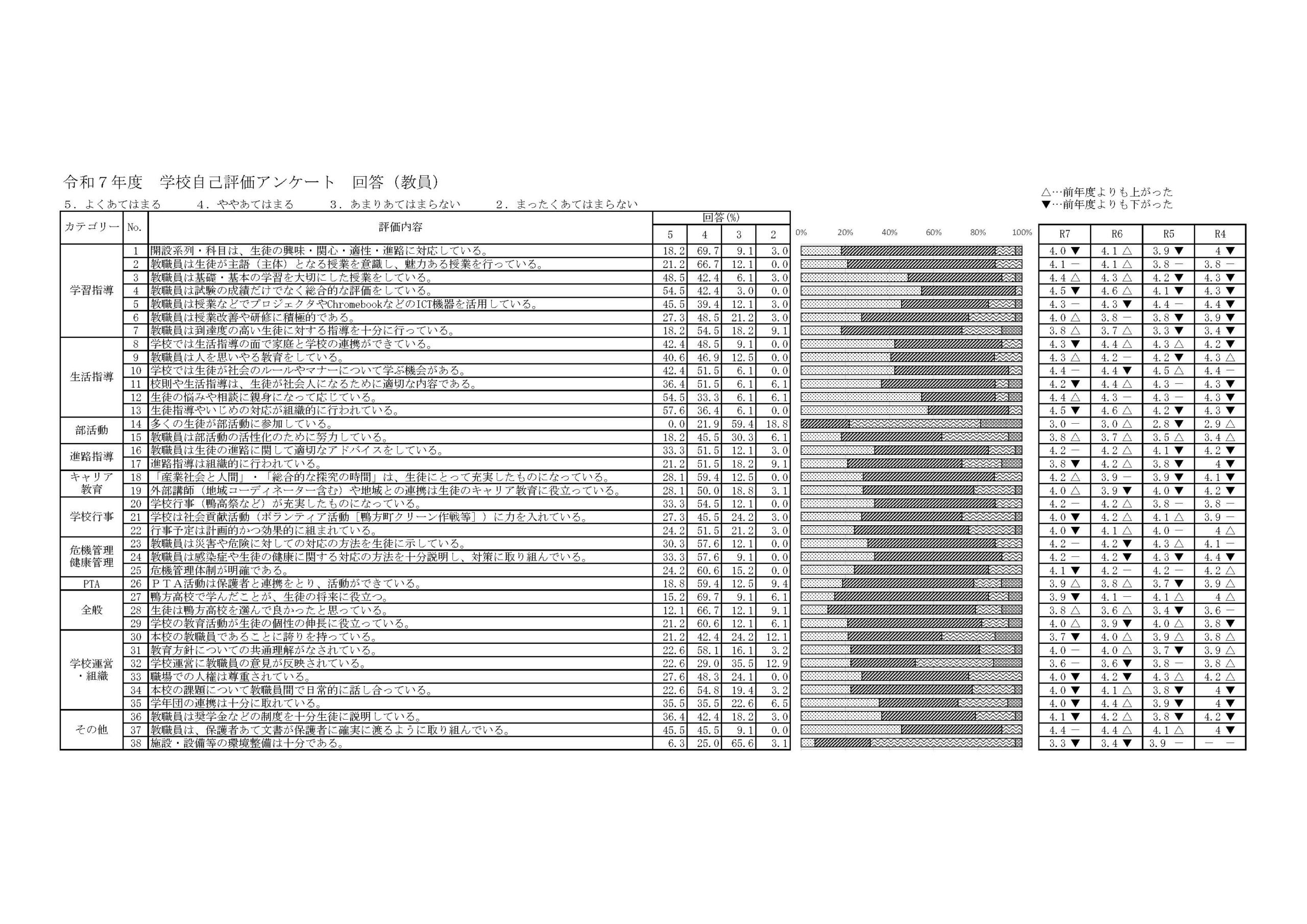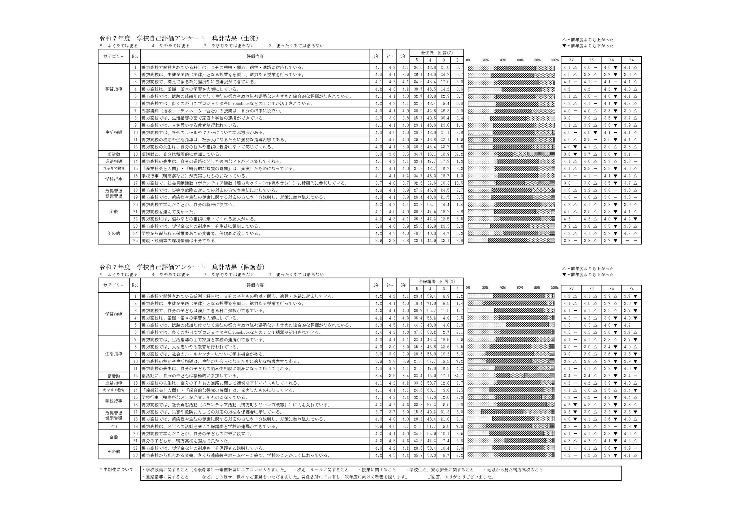 令和7年度学校自己評価アンケート集計結果について 2026.01.09 令和7年度 学校自己評価アンケートの集計結果を報告します。 学校自己評価アンケート(生徒・保護者) 学校自己評価アンケート(教職員)からご確認いただけます。