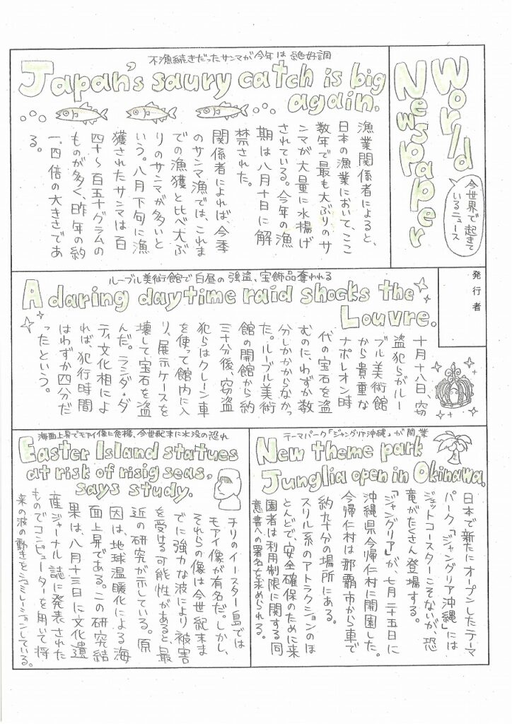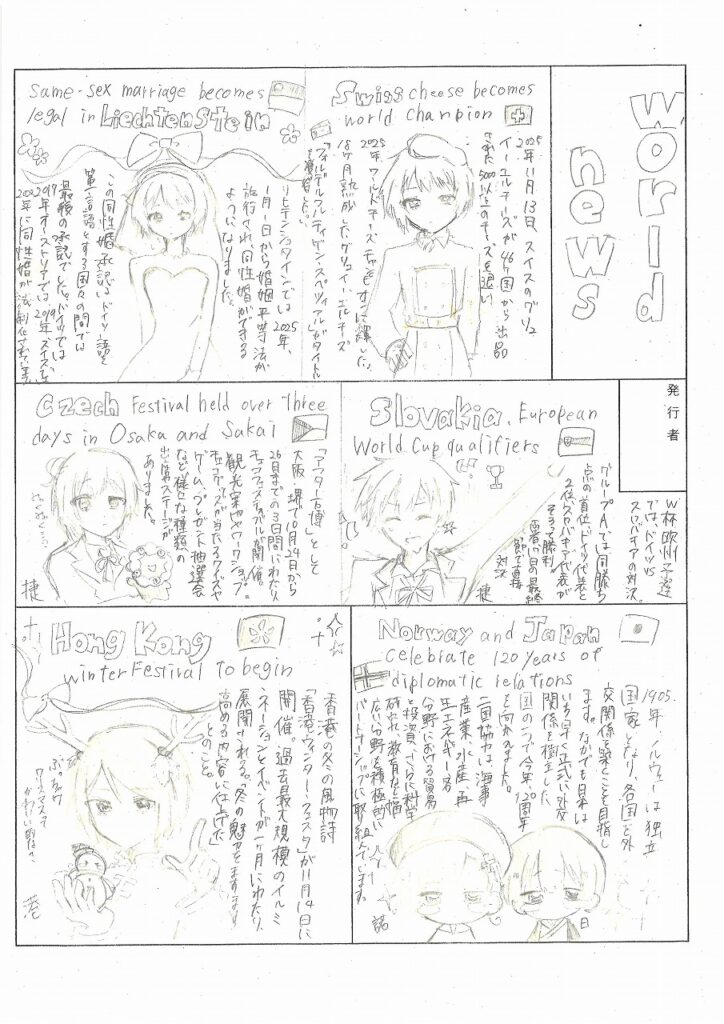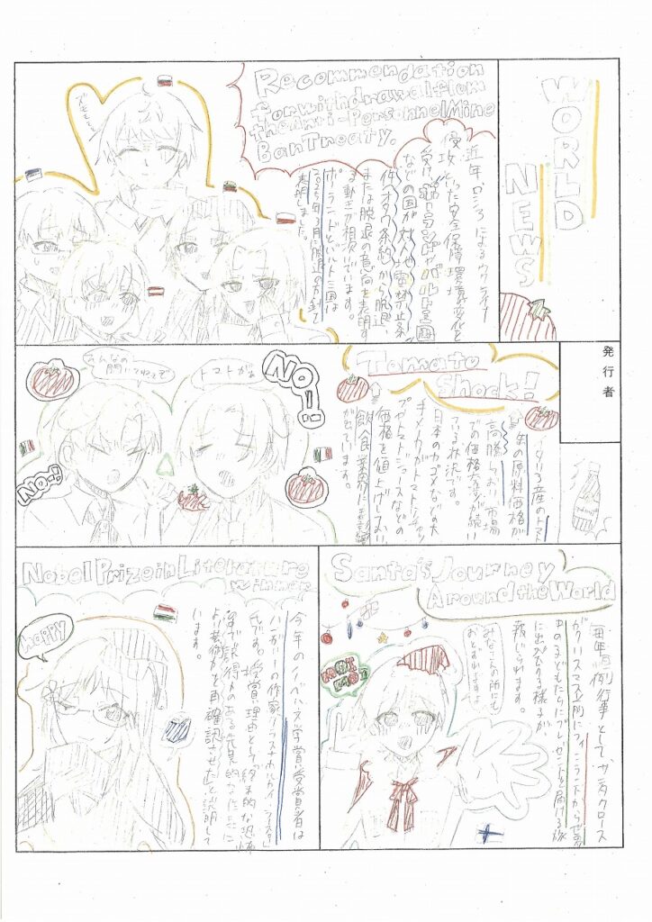 World News Part2 2025.12.03学校生活, 授業風景 1年生「英語コミュニケーションⅠ」の授業で、世界のニュースについてまとめる新聞づくりを行いました。ドジャースワールドシリーズ制覇のことや、W杯予選など、スポーツに関する記事が多くみられました。 共有:FacebookX